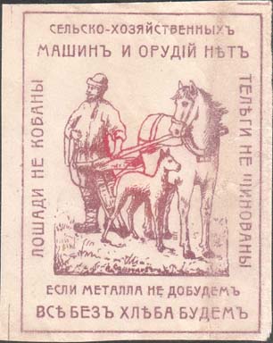 1925 1925(?) г. Разм. 52 х 65 мм. Одноцветная печать на белой бумаге. В прямоугольной рамке разм. 45,5 х 60,5 мм стоит пахарь и лошадь с жеребенком. По внутреннему периметру рамки текст: «Сельско-хозяйственных машин и орудий нет. Если металла не добудем, все без хлеба будем. «Лошади не кованы. Телеги не шинованы».