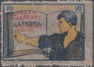 1932 1932 г. Разм. 45 х 32 мм. Трехцветная печать на тонкой полупрозрачной бумаге. Нерегулярная зубц. В центре в прямоугольной рамке человек, указывающий правой рукой на открытую книгу, на странице которой текст в пять строк: «Добьем наследие царизма - неграмотность». Сверху по углам цифры номинала.