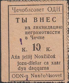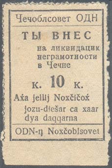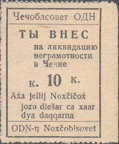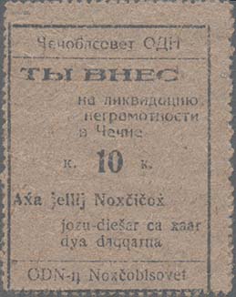 1930 1930(?) г. Разм. рамки 33 х 45 мм. Одноцветная печать на бумаге низкого качества различных цветов. Зубц. 11 1/2. В центре в прямоугольной рамке номинал. Сверху текст в четыре строки: «Ты внес на ликвидацию неграмотности в Чечне». Внизу тот же текст в четыре строки на чеченском языке латинским шрифтом. Сверху текст: «Чечоблсовет ОДН». Внизу тот же текст на чеченском языке латинским шрифтом.