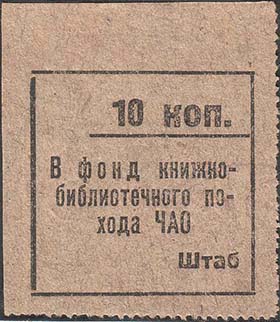 1930 1930(?) г. Разм. по перфорации 46 х 53 мм. Одноцветная печать на серой бумаге низкого качества. В центре в прямоугольной рамке разм. 38 х 38 мм сверху номинал с подчеркиванием. В центре текст в четыре строки: «В фонд книжно-библиотечного похода ЧАО. Штаб».