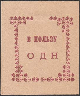 1932 1932 г. 07.-08.11.1932 г. Разм. 43 х 53 мм. Одноцветная печать на желтоватой бумаге. В центре в декоративной рамке 31 х 37 мм текст в две строки: «В пользу ОДН».