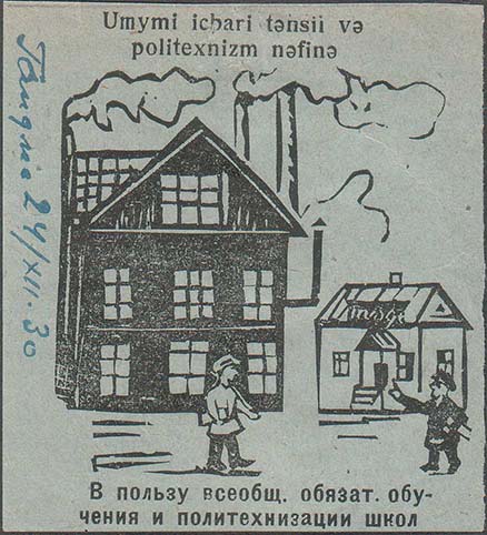 1930 1930 г. 24.12.1930 г. Разм. 73 х 80 мм. Одноцветная печать низкого качества на зелено-серой бумаге. В центре двое рабочих на фоне школы и завода. Сверху текст в две строки на азербайджанском языке латинским шрифтом. Внизу текст в две строки: «В пользу всеобщ[его]. обязат[ельного]. обучения и политехнизации школ».
