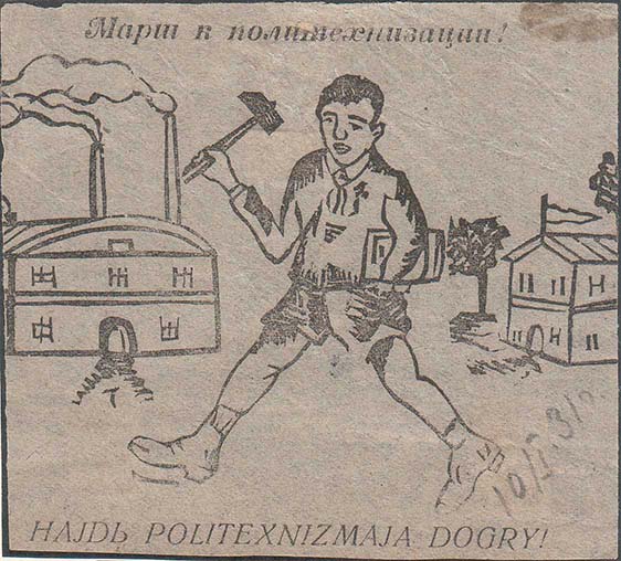 1931 1931 г. 10.01.1931 г. Разм. 93 х 85 мм. Одноцветная печать низкого качества на тонкой серо-зеленой бумаге. В центре пионер с молотком и книгой. Слева завод, справа школа. Сверху текст: «Марш к политехнизации!». Внизу текст на азербайджанском языке латинским шрифтом.