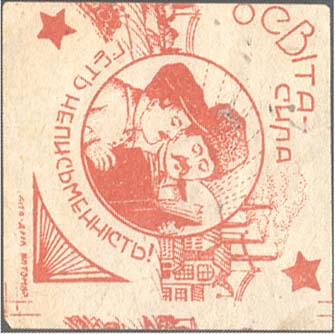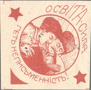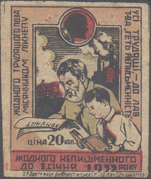 1930 1930(?) г. Ромб разм. 73 х 73 мм. Одноцветная печать на желтоватой бумаге. В центре в круглой рамке диаметром 35 мм рабочий и крестьянин читают букварь на фоне восходящего солнца. В левом верхнем углу текст на украинском языке: «Знание - сила». В правом нижнем углу полукругом текст на украинском языке: «Долой неграмотность!». В левом нижнем углу и в правом верхнем пятиконечные звезды. Справа внизу мелким шрифтом выходные данные неразборчиво.