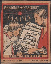 1925 1925 г. Разм. 35 х 40 мм. Трехцветная печать на желтоватой бумаге. В прямоугольной рамке в центре рабочий с молотом показывает крестьянину с серпом раскрытую книгу. Сверху текст в две строки на украинском языке: «Выполним завет Ильича». На развороте книги продолжение текста на украинском языке в шесть строк: «Ни одного неграмотного к 10-й годовщине Октябрьской революции». Внизу номинал. Внизу под рамкой выходные данные мел-ким шрифтом: «Ек-слав Руп №840 Типолит «1-е мая»».