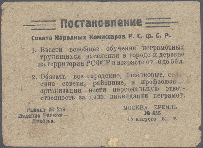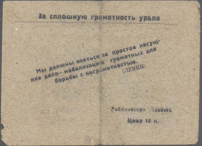 1931 1931 г. Листок разм. 107 х 78 мм. Одноцветная двухсторонняя печать на серой бумаге низкого качества. На лицевой стороне в центре по диагонали текст в четыре строки: «Мы должны взяться за простое насущное дело – мобилизацию грамотных для борьбы с неграмотностью. (Ленин)». Сверху текст с подчеркиванием волнистой линией: «За сплошную грамотность Урала». В правом нижнем углу текст в две строки: «Райкомиссия ликбеза Цена 15 к.». На оборотной стороне в центре текст в девять строк: «Постановление Совета Народных Комиссаров Р.С.Ф.С.Р. 1. Ввести всеобщее обучение неграмотных трудящихся населения в городе и деревне на территории РСФСР в возрасте от 16 до 50 л. 2. Обязать все городские, поселковые, сельские советы, районные и профсоюзные организации нести персональную ответственность за дело ликвидации неграмот[ности].». В правом нижнем углу текст в три строки: «Москва- Кремль №855 15 августа – 31 г.». В левом нижнем углу текст в три строки: «Райлит №279 Издание райком - Ликбеза».