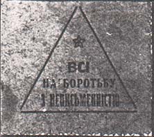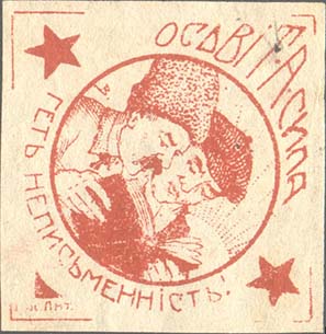 1929 1929 г. Разм. 46 х 40 мм. Одноцветная печать на плотной красно-фиолетовой бумаге. Зубц. 11 1/2. В треугольной рамке сверху пятиконечная звезда. Ниже текст в три строки на украинском языке: «Все на борьбу с неграмотностью».
