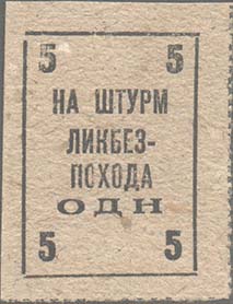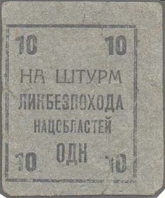 1929 1929 г. Разм. 39 х 47 мм. Одноцветная печать на серо-зеленоватой бумаге низкого качества. В центре в прямоугольной рамке разм. 31 х 37 мм текст в четыре строки: «На штурм ликбезапохода нацобластей ОДН». По внутренним углам рамки цифры номинала.
