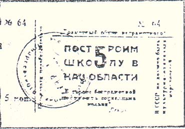 1931 1931 г. Листок из квитанционной книжки разм. ≈ 89 х 60 мм. Одноцветная печать на бумаге различных цветов. В центре номинал и текст в три строки: «Построим школу в нацобласти». Сверху номер и текст с подчеркиванием: «Грамотный, обучи неграмотного». Внизу текст в четыре строки: ««В стране безграмотной построить социализм нельзя» Ленин». Справа вертикально снизу вверх текст в три строки: «В СССР не должно быть культурно-отсталых народностей». Слева вертикальная черта и текст снизу вверх: «Без печати недействительно». На лицевой стороне фиолетовый оттиск круглой контрольной печати. На корешке сверху номер и номинал внизу.