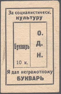 1933 1933 г. Разм. 34 х 54 мм. Одноцветная печать на толстой белой бумаге. В центре в двойной прямоугольной рамке разм. 28 х 45 слева текст: «Букварь». Ниже номинал. Справа вертикально аббревиатура «О.Д.Н.». Между рамками сверху текст в две строки: «За социалистическ[ую]. культуру». Внизу между рамками текст в две строки: «Я дал неграмотному букварь».