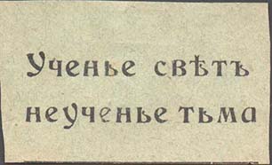 1915 1915(?) г. Разм. 52 х 32 мм. Одноцветная печать на серо-зеленоватой бумаге. В центре в две строки: «Ученье свет неученье тьма».