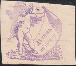 1915 1915(?) г. Разм. 43 х 36 мм. Одноцветная печать на белой тетрадной бумаге в линейку. На лицевой стороне фиолетовый оттиск ручного штампа. На штампе ангел держит картуш с текстом в две строки: «Детям на школу».