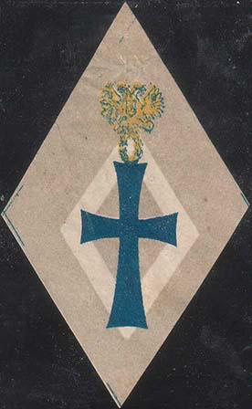 1917 1917 г. 22.-23.10.1917 г. Ромб разм. 47 х 76 мм. Трехцветная печать на белой бумаге. В центре знак выпускника университета. Орел на знаке без царских регалий. По углам ромба разграничительные линии.