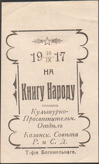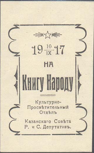 1917 1917 г. 10.11.1917 г. Разм. 53 х 82 мм. Одноцветная печать на бумаге различных цветов. В центре в декоративной рамке разм. 45 х 64 мм текст в три строки: «10.IX.1917 На книгу народу». Сверху декоративный элемент в виде пятиконечной звезды и лучей. Внизу текст в пять строк мелким шрифтом: «Культурно-Просветительный Отдел Казанского Совета Р[абочих]. и С[олдатских]. Депутатов».