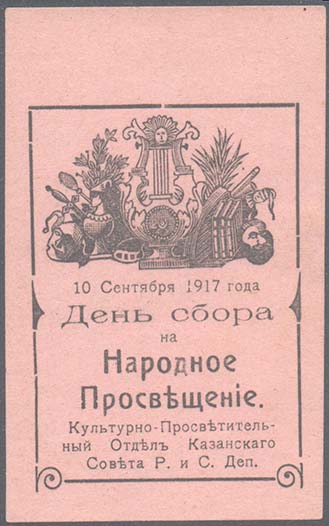 1917 1917 г. 10.11.1917 г. 1917 г. (10.11.1917 г.). Разм. 54 х 86 мм. Одноцветная печать на бумаге различных цветов. В центре в прямоугольной рамке с орнаментом в нижних углах разм. 45 х 64 мм текст в пять строк: «10 Сентября 1917 года День сбора на Народное Просвещение. Сверху различные предметы – символы науки и искусств. Внизу текст в три строки мелким шрифтом: «Культурно-Просветительный Отдел Казанского Совета Р[абочих]. и С[олдатских]. Деп[утатов].».