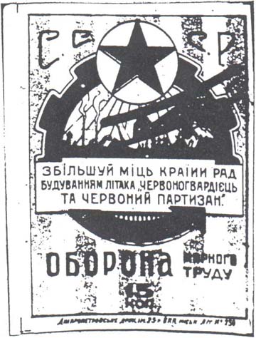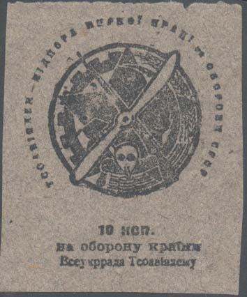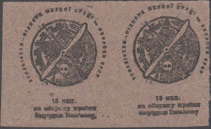 1930 1930 г. Разм. 60 х 71 мм. Одноцветная печать низкого качества на серой (оттенки) бумаге. Рис. аналогичен предыдущему выпуску, но внизу текст в две строки: «На оборону страны Всеукрсовет Осоавиахима».