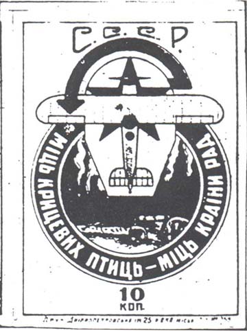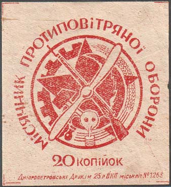 1930 1930 г. Разм. 56 х 61 мм. Одноцветная печать на желтоватой бумаге. В центре эмблема ОСО-АВИАХИМ. По окружности текст на украинском языке: «Месячник противовоздушной обороны». Внизу текст на украинском языке: «20 копеек». Внизу выходные данные мелким шрифтом на украинском языке: «Днепропетровская Тип. Им. 25 – летия ВКП горлит №1265».