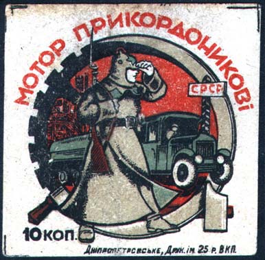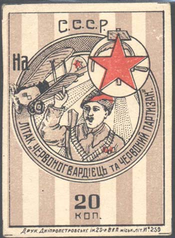 1931 1931 г. Разм. 62 х 62 мм. Многоцветная печать на желтоватой бумаге. В центре в рамке из серпа, молота и шестерни красноармеец с винтовкой на плече. Левая рука поднята к козырьку шлема. На заднем плане грузовик возле пограничного стол-ба. Сверху полукругом текст на украинском языке: «Мотор пограничникам». Слева внизу номинал. Справа внизу мелким шрифтом выходные данные на украинском языке: «Днепропетровск, Тип. им. 25–летия ВКП».