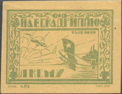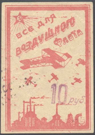 1923 1923 г. Разм. рамки 50 х 74 мм. Одноцветная печать на желтоватой бумаге. В двойной прямоугольной рамке в левом верхнем углу пятиконечная звезда с лучами, ниже текст по диагонали в три строки: «Все для воздушного флота». В центре пять самолетов-бипланов над заводскими зданиями. На лицевой стороне фиолетовая надпечатка номинала ручным штампом в виде тек-ста: «10 руб.».