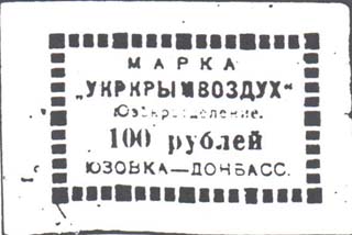 1923 1923 г. Разм. рамки 42 х 27 мм. Двухцветная печать на белой бумаге. В рамке из прямоугольников текст в четыре строки: «Марка «Укркрымвоздух» Юзокротделение. Юзовка - Донбасс».