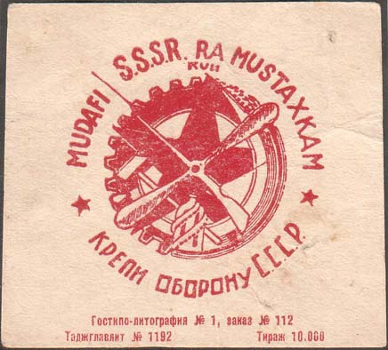 1931 1931 г. Разм. 72 х 65 мм. Одноцветная печать на белой бумаге. В центре эмблема ОСОАВИАХИМ. Слева и справа пятиконечные звезды. Внизу полукругом текст: «Крепи оборону С.С.С.Р.». Сверху полукругом текст на таджикском языке латинским шрифтом. Внизу мелким шрифтом выходные данные в две строки: «Гостипо-литография №1, заказ 112. Таджглавлит №1192. Тираж 10.000».