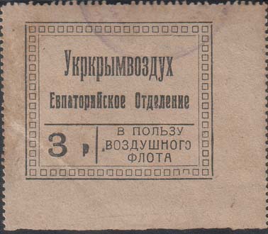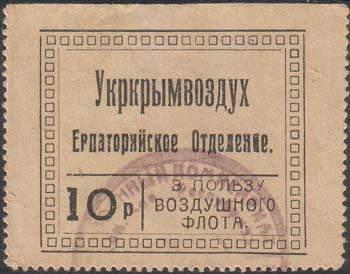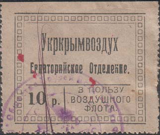 1923 1923 г. Разм. рамки 45 х 35 мм. Одноцветная печать на бумаге различных цветов. Зубц. 11 1/2. В двой-ной рамке прямоугольной декоративной рамке сверху текст в две строки: «Укркрымвоздух Евпаторийское Отделение». Слева внизу номинал. Справа внизу текст в три строки: «В пользу Воздушного флота».