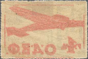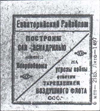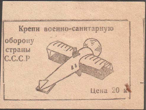 1930 1930(?) г. Разм. рамки 72 х 46 мм. Одноцветная печать на желтоватой бумаге. В прямоугольной рамке самолет-биплан с летчиком в кабине, летящий вправо. Слева сверху текст в четыре строки: «Крепи военно-санитарную оборону страны С.С.С.Р.». Справа внизу номинал: «Цена 20 к.».