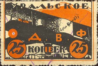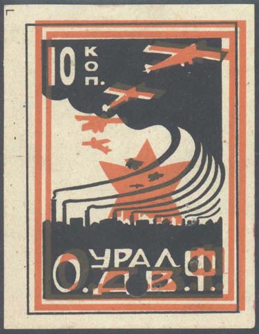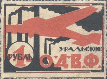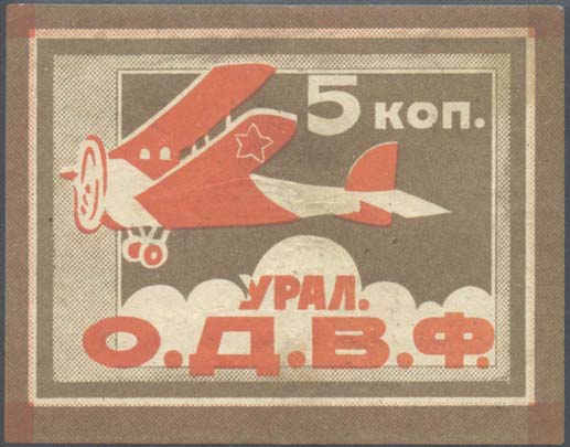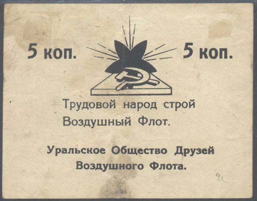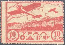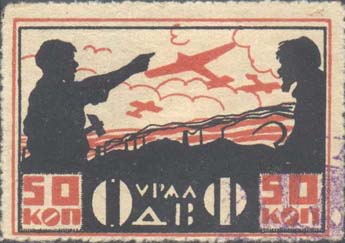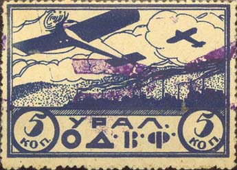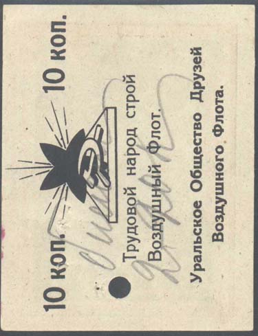 1924 1924 г. Первый областной выпуск. Двухцветная двухсторонняя печать на белой бумаге. На лицевой стороне рисунок и номинал. На оборотной стороне в центре пятиконечная звезда, серп и молот. Сверху номинал. Ниже текст в две строки: «Трудовой народ, строй Воздушный Флот». Внизу текст в две строки: «Уральское Общество Друзей Воздушного Флота».