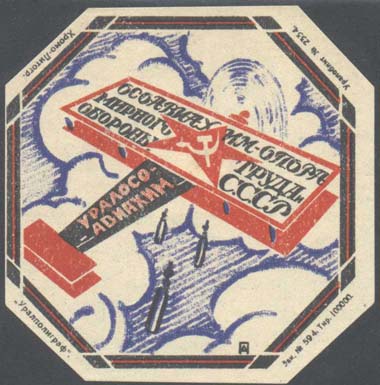 1930 1930(?) г. Виньетка в форме восьмиугольника разм. 63 х 63 мм. Трехцветная печать на белой бумаге. В двойной восьмиугольной рамке самолет в облаках, сбрасывающий бомбы. На крыльях самолета пятиконечная звезда с серпом и молотом и текст в три строки: «ОСОАВИАХИМ – опора мирного труда и обороны СССР». На фюзеляже самолета текст: «Уралосоавиахим». По углам выходные данные мелким шрифтом: «Зак. № 594. Тир. 100000. Уралоблит №2334. Хромо-литогр. «Уралполиграф»».