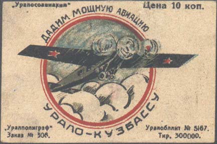1932 1932 г. Разм. 72 х 48 мм. Трехцветная печать на желтой бумаге. В центре в круглой рамке диаметром 39 мм трехмоторный самолет-моноплан над облаками. С наружной стороны рамки текст: «Дадим мощную авиацию Урало-Кузбассу». В левом верхнем углу текст: ««Уралосоавиахим»». В правом верхнем углу номинал: «Цена 10 коп.». Внизу выходные данные мелким шрифтом в две строки: «Уралполиграф». Заказ N 306, Уралобллит N 5167, тир. 300000».