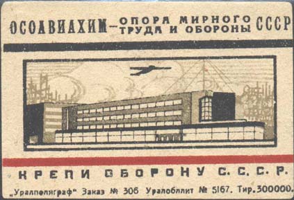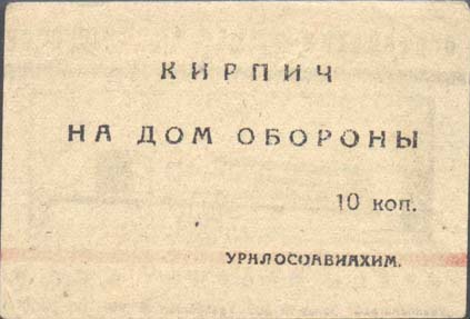 1932 1932 г. Разм. 72 х 50 мм. Трехцветная двухсторонняя печать на желтоватой бумаге. На лицевой стороне в центре в прямоугольной рамке разм. 62 х 22,5 мм здание Дома Обороны. Сверху силуэт самолета в облаках. Сверху текст: «ОСОАВИАХИМ – опора мирного труда и обороны СССР». Внизу текст: «Крепи оборону СССР». Внизу выходные данные мелким шрифтом: ««Уралполиграф» Заказ N 306, Уралобллит N 5167. Тир. 300000». На оборотной стороне текст в четыре строки: «Кирпич на дом обороны 10 коп. УРАЛОСО-АВИАХИМ».