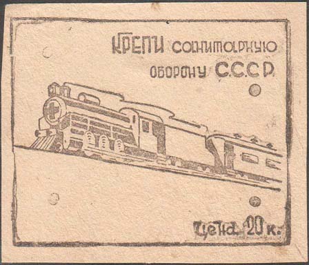 1931 1931 г. Разм. рамки 67 х 54 мм. Одноцветная печать на сероватой бумаге низкого качества. В центре санитарный поезд. Справа сверху текст в две строки: «Крепи санитарную оборону С.С.С.Р.». Справа внизу номинал: «Цена 20 к.».