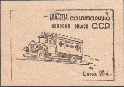 1933 1933 г. Разм. рамки 67 х 42 мм. Одноцветная печать на сероватой бумаге низкого качества. В центре санитарная машина. Справа сверху текст в две строки: «Крепи санитарную оборону союза С.С.Р.». Справа внизу номинал: «Цена 20 к.».
