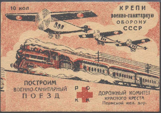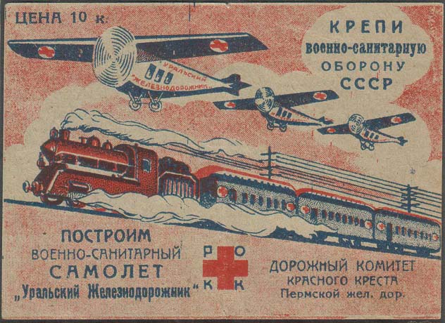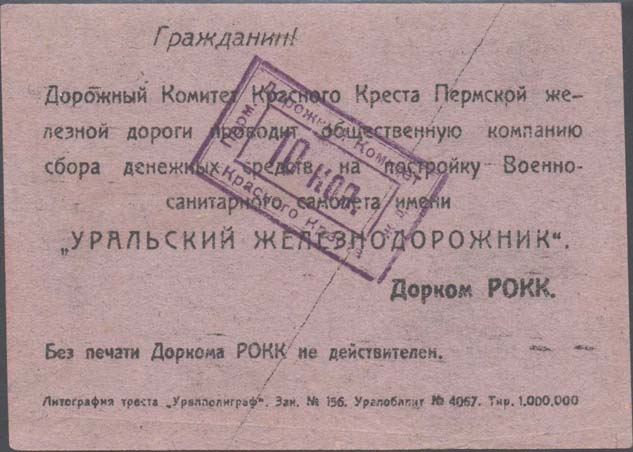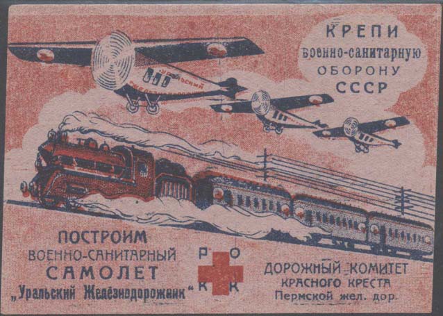 1931 1931 г. Листок разм. 106 х 75 мм. Трехцветная двухсторонняя печать на бумаге различных цветов. На лицевой стороне в центре санитарный поезд и три санитарных самолета. На самолетах надпись: «Уральский железнодорожник». В правом верхнем углу текст в четыре строки: «Крепи военно-санитарную оборону СССР». Внизу в центре красный крест и аббревиатура «РОКК». Слева внизу текст в четыре строки: «Построим военно-санитарный самолет «Уральский Желез-нодорожник»». Справа внизу текст в три строки: «Дорожный комитет Красного Креста Пермской жел[езной]. Дор[оги].». На оборотной стороне текст в восемь строк: «Граждане! Дорожный Комитет Красного Креста Пермской железной дороги проводит общественную компанию сбора денежных средств на постройку Военно-санитарного самолета имени «Уральский железнодорожник». Дорком РОКК. Без печати Доркома РОКК не действителен». Внизу выходные данные мелким шрифтом: «Литография треста «Уралполиграф». Зак. №156. Уралоблит №4067. Тир. 1.000.000».
