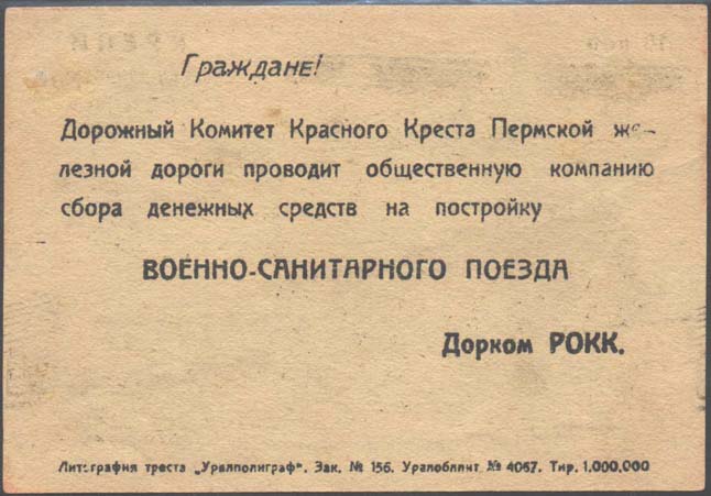 1931 1931 г. Листок разм. 106 х 75 мм. Трехцветная двухсторонняя печать на желтоватой бумаге. На лицевой стороне в центре санитарный поезд и три санитарных самолета. В правом верхнем углу текст в четыре строки: «Крепи военно-санитарную оборону СССР». В левом верхнем углу номинал. Внизу в центре красный крест и аббревиатура «РОКК». Слева внизу текст в три строки: «Построим военно-санитарный поезд». Справа внизу текст в три строки: «Дорожный комитет Красного Креста Пермской жел[езной]. дор[оги].». На оборотной стороне текст в шесть строк: «Граждане! Дорожный Комитет Красного Креста Пермской железной дороги проводит общественную компанию сбора денежных средств на постройку Военно-санитарного поезда». Дорком РОКК». Внизу выходные данные мелким шрифтом: «Литография треста «Уралполиграф». Зак. №156. Уралоблит №4057. Тир. 1.000.000».