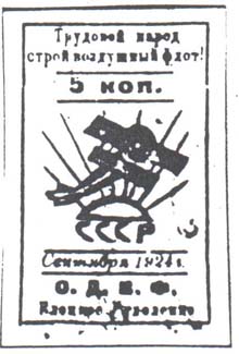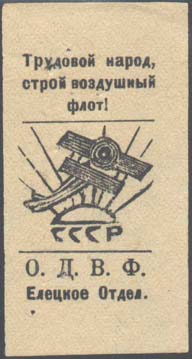1924 1924 г. Второй выпуск. Разм. 31 х 51 мм. Одноцветная печать на желто-ватой бумаге. В центре в лучах восходящего солнца самолет-биплан, летящий вправо вверх. Под солнцем аббревиатура «СССР». Сверху текст в три строки: «Трудовой народ, строй Воздушный Флот!». Внизу текст в две строки: «О.Д.В.Ф. Елецкое отдел[ение].».