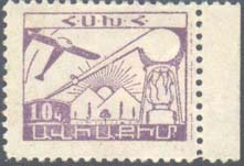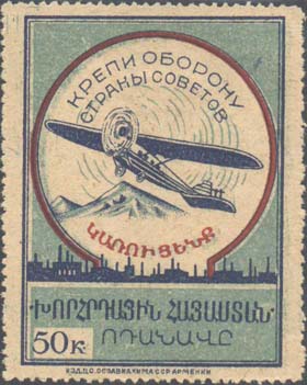 1933 1933 г. Разм. рамки 40 х 53 мм. Трехцветная печать на белой бумаге. Зубц. 11 1/2. В рамке в круге самолет, летящий влево, гора Арарат и заводские здания. Сверху полукругом текст в две строки: «Крепи оборону страны Советов». Внизу текст на армянском языке в три строки: «Построим самолет «Социалистическая Армения»». Под рамкой выходные данные «Изд. ЦС Осоавиахима СССР Армении».