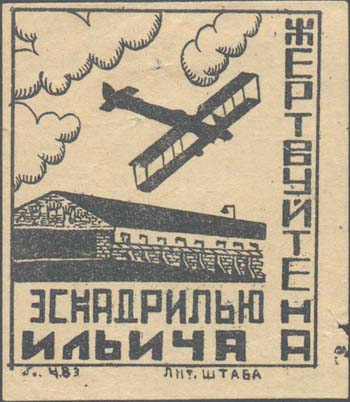 1924 1924 г. Разм. рамки 51,5 х 60 мм. Одноцветная печать на желтоватой бумаге. В прямоугольной рамке самолет-биплан, летящий вправо над казармой. Слева вертикально текст: «Жертвуйте на». Внизу в две строки продолжение текста: «Эскадрилью Ильича». Под рамкой выходные данные: «Л. 483. Лит. штаба».