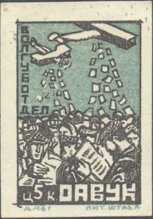 1925 1925 г. Разм. рамки 29 х 45 мм. Двухцветная печать на белой бумаге. Различные рисунки. Текст: «Волгуботдел», внизу «ОАВУК». Внизу под рамкой выходные данные: «Т. НВГ Лит. штаба.»