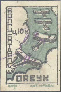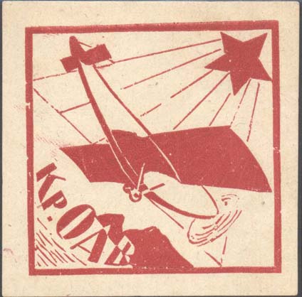1924 1924(?) г. Ромб разм. рамки 83 х 83 мм. Одноцветная печать на белой бумаге. В рамке самолет над берегом моря. Сверху пятиконечная звезда с лучами. Внизу аббревиатура «Кр.ОАВ».