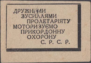 1931 1931 г. 30.101931 г. Разм. рамки 54,5 х 34,5 мм. Одноцветная печать на сероватой (оттенки) бумаге. В прямоугольной рамке текст в семь строк на украинском языке: «Дружными усилиями пролетариата моторизуем пограничную охрану С.С.С.Р.».