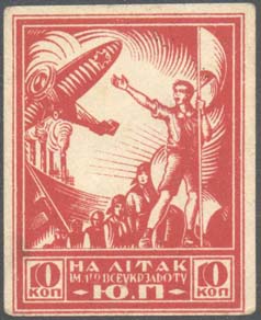 1932 1932 г. Разм. рамки 35 х 45 мм. Одноцветная печать на белой бумаге. В центре справа строй пионеров с флагом. Слева заводские здания. В левом верхнем углу самолет-моноплан в облаках. Внизу текст на украинском языке в три строки: «На самолет им. 1-го Всеукрслета Ю[ных]. П[ионеров].». Внизу по углам номинал.