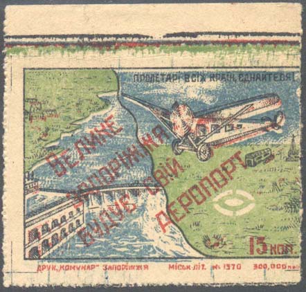 1932 1932(?) г. 1932(?) г. Разм. рамки 67 х 46 мм. Многоцветная печать на толстой желтоватой бумаге низкого качества. Нерегулярная зубц. В прямоугольной рамке в центре самолет, летящий влево над Днепровской ГЭС и аэродромом. В центре по диагонали текст на украинском языке в четыре строки: «Большое Запорожье строй свой аэропорт». В правом верхнем углу текст: «Пролетарии всех стран, соединяйтесь!». В правом нижнем углу номинал. Внизу под рамкой выходные данные на украинском языке мелким шрифтом: «Тип. «Коммунар». Запорожье. Горлит. N 1370, 300000 экз.».