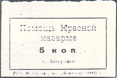 1924 1924 г. Одноцветная печать на розовой бумаге. В прямоугольной рамке в центре номинал. Сверху текст в две строки: «Помощь Красной казарме». Внизу текст: « г. Запорожье». Внизу под рамкой выходные данные мелким шрифтом.