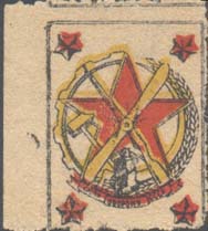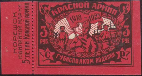 1923 1923 г. Листок из квитанционной книжки разм. рамки 52 х 36 мм. Одноцветная печать на розово-красной бумаге. Левосторонняя зубц. 11 1/2. В центре в овальном венке красноармеец, рабочий и крестьянин на фоне восходящего солнца, поля и завода. Красноармеец в руках держит флаг с датами: «1918-1923». Слева и справа от венка номинал. По внутренним углам рамки буквы аббревиатуры: «С.С.С.Р.». Сверху полукругом текст: «Красной армии». Внизу полукругом продолжение текста: «Губисполком Подолии». На талоне вертикально текст в три строки: «Корешок юбилейной марки 5-летия Красной армии».