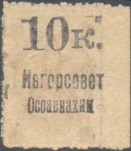 1930 1930 г. Разм. рамки 24 х 34 мм. Трехцветная печать на желтоватой бумаге. В двойной прямоугольной рамке в центре эмблема ОСОАВИАХИМ. По углам пятиконечные звезды. На оборотной стороне надпечатка в виде текста в три строки: «10 к. Ивангорсовет Осоавиахим».