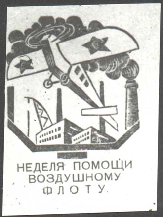 1923 1923 г. Разм. 53 х 72 мм. Одноцветная печать на желтоватой бумаге. На фоне заводских зданий самолет-моноплан, летящий влево вверх. Внизу текст в три строки: «Неделя помощи воздушному флоту».