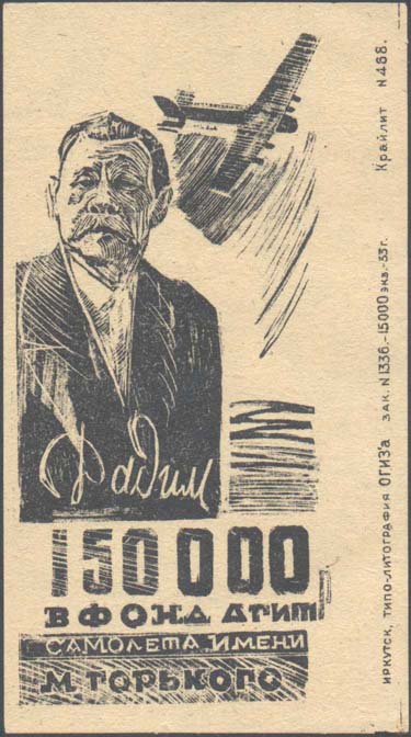 1933 1933 г. Листок разм. 62 х 111 мм. Одноцветная печать на желтоватой бумаге. В центре слева портрет А.М.Горького. Справа сверху многомоторный самолет в облаках. Внизу текст в пять строк: «Дадим 150000 р. в фонд агитсамолета имени М. Горького». Слева вертикально снизу вверх мелким шрифтом выходные данные: «Иркутск. Типо-литография ОГИЗа зак. 1336-15000 экз. 33 год. Крайлит №468».