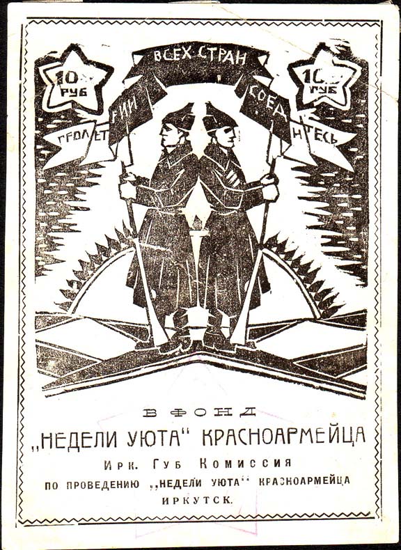1924 1924(?) г. Листок разм. 96 х 132 мм. Одноцветная печать низкого качества на белой бумаге. В прямо-угольной декоративной рамке разм. 88 х 122 мм в центре двое красноармейцев с винтовками на фоне различных декоративных элементов. Сверху на ленте текст: «Пролетарии всех стран, соединяйтесь». Сверху по углам в рамках в форме пятиконечных звезд номинал. Внизу текст в пять строк: «В фонд «Недели уюта» красноармейца. Ирк[утская]. Губ[ернская]. Комиссия по проведению «Недели уюта» красноармейца Иркутск». На лицевой стороне внизу фиолетовый оттиск контрольной печати в форме пятиконечной звезды с неразборчивым текстом.