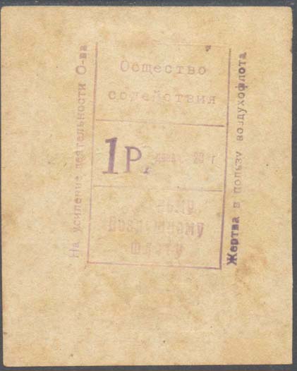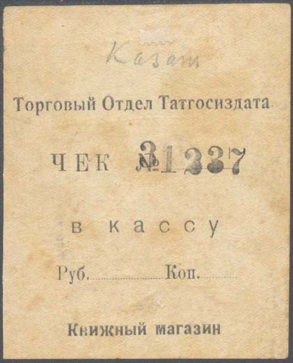 1923 1923 г. Разм. 71 х 86 мм. Одноцветная печать на желтоватой бумаге. На лицевой стороне текст в пять строк: «Торговый Отдел Татгосиздата Чек № .. в кассу Руб... Коп... Книжный магазин». На оборотной стороне фиолетовый оттиск прямоугольного штампа разм. рамки 32 х 53 мм. Прямоугольная рамка штампа разделена на три горизонтальных части. В центре номинал: «1 р. дензн. 23 г.». Сверху текст в две строки: «Общество содействия». Внизу продолжение текста в две строки: «Красному воздушному флоту». Слева от рамки штампа текст снизу вверх: «На усиление деятельности О-ва». Справа от рамки штампа текст снизу вверх: «Жертва в пользу воздухфлота».